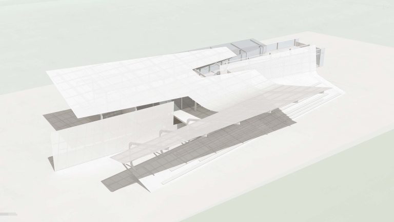The building will function as an event venue with a covered outdoor stage and a large indoor multipurpose space. Just about all of Northwest Ohio is flat so there is no topography to work with. However, the fields around the site will alternate between crops each year with corn growing 8′ tall before harvesting. The design takes vegetation height into account lifting much of the program above 10 feet to give clear views throughout.